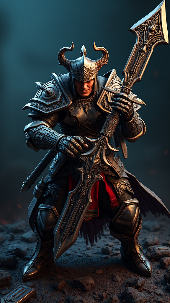 Brutal warrior with malevolent grin, clad in intricately detailed armor wielding a finely crafted weapon, set against a backdrop of a dark-hued battlefield, striking a commanding pose. The scene captures an epic composition with dramatic shadows and cinematic lighting, rendered in a trending Artstation style. Designed as an 8k wallpaper using Blender, with VFX and an isometric perspective to enhance the visual storytelling. This 3D octane render showcases a masterful blend of artistic finesse and technical prowess, maintaining a balance between the fierce persona and the militant ambiance.