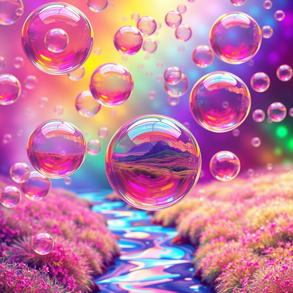 Bubbleverse in a chromatic realm, where floating spheres of translucent hues drift through a kaleidoscopic sky, their iridescent surfaces reflecting the vibrant spectrum surrounding them. Each bubble holds its own miniature landscape of swirling colors, creating a mesmerizing symphony of shifting shades. In this world, rivers of liquid light flow gently through multicolored meadows, and the air is alive with the soft glow of luminescent flora. Creatures of pure pigment flit about, leaving trails of dazzling colors in their wake, as the harmonious blend of tones fills the senses with wonder and delight.