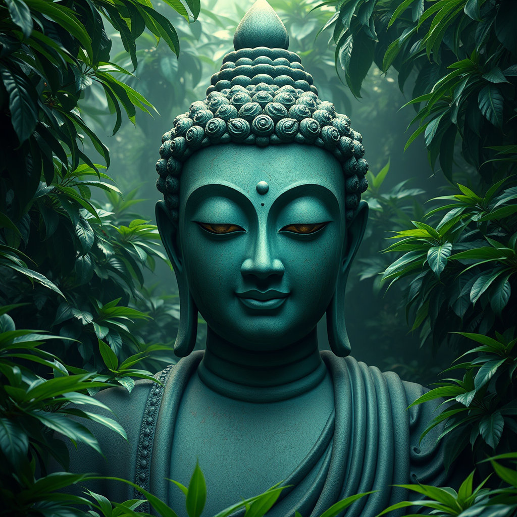 buddha encircled by lush green foliage, aged jade hues, divine presence, wisdom, vitality, grand scale, full face perspective, intricate anatomical accuracy, photorealistic depiction, superb detailing, elaborate central composition, graceful, standout visual effects, utilization of cutting-edge digital rendering techniques, pronounced contrast, ethereal atmosphere, ultra-detailed cinematic flair, hyperfocused clarity, extraordinary depth of field, a true masterpiece with vibrant colors, high-resolution digital concept art, inspired by Cambodian temples set in a dense jungle, reminiscent of works by Ed Blinky, Jeremy Mann, and Greg Manchez, trending on art platforms, augmented with complex detailing and sharp focus for a dramatic effect, resembling a photorealistic painting influenced by styles of Midjourney and Gregg Rutkowski, emphasizing body and neck anatomy through intentional crop while maintaining artistic essence.