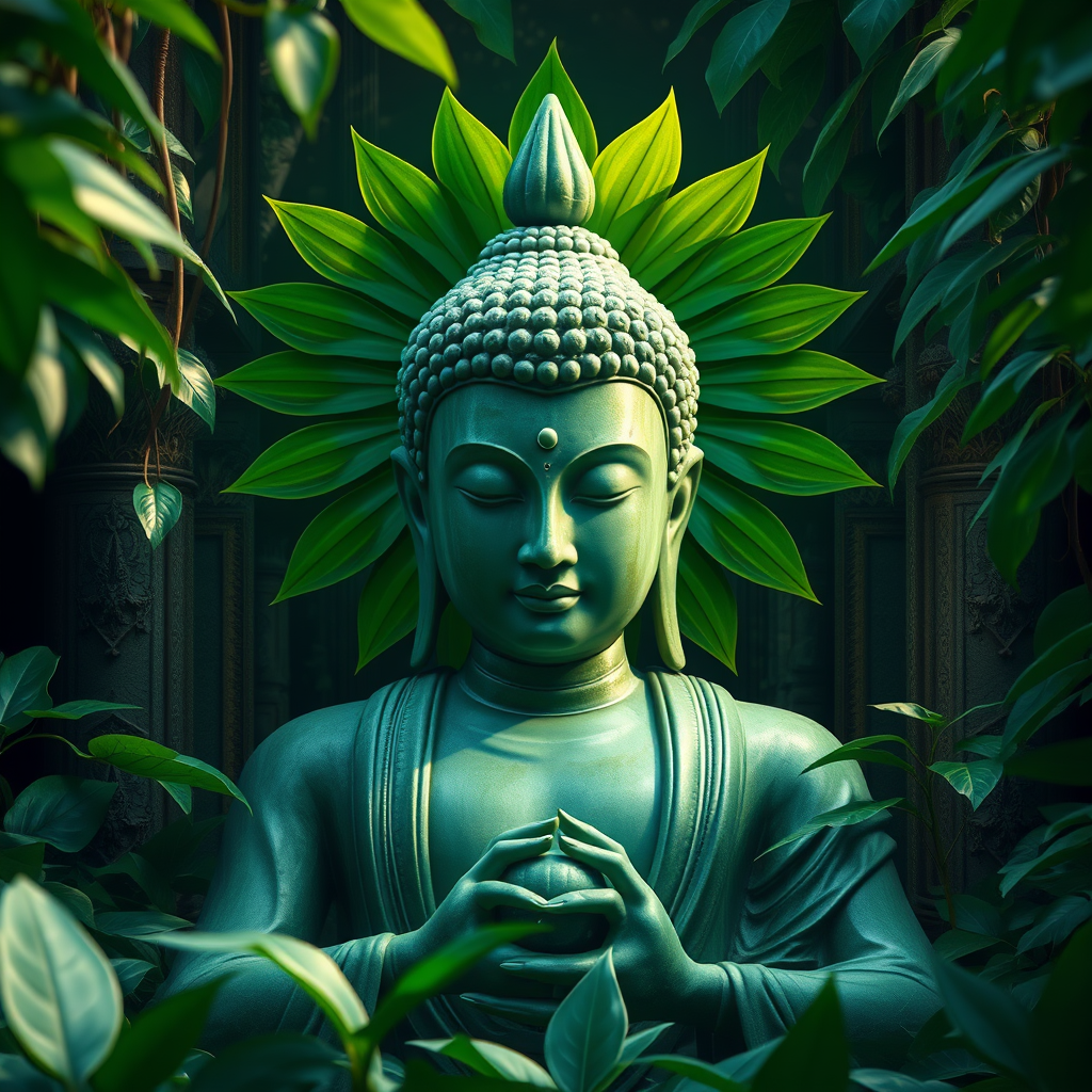 Buddha nestled within a halo of vibrant green leaves, reminiscent of ancient jade, embodying a deity of wisdom and life, presented in an epic, full-face view. The rendering captures vivid anatomical detail with photorealistic precision, composed centrally for elegant impact. Enhanced with visual effects akin to those from Unreal Engine 5, the image boasts extreme contrast and atmospheric ultra-detail. A cinematic, sensual focus is achieved with sharp clarity and hyperrealism, offering great depth of field. This masterpiece utilizes vivid colors and 4k resolution, suitable for concept art trending on ArtStation. The background is intricately detailed, set in a Cambodian temple amidst a dense jungle. Artists like Ed Blinky, Jeremy Mann, and Greg Manchez inspire the work, with elements of Mijourney and Gregg Rutkowski’s photorealistic style, avoiding any unwanted flaws like deformed or disfigured features. The painting is composed without any distracting elements such as text or camera anomalies, ensuring a breathtaking visual experience.