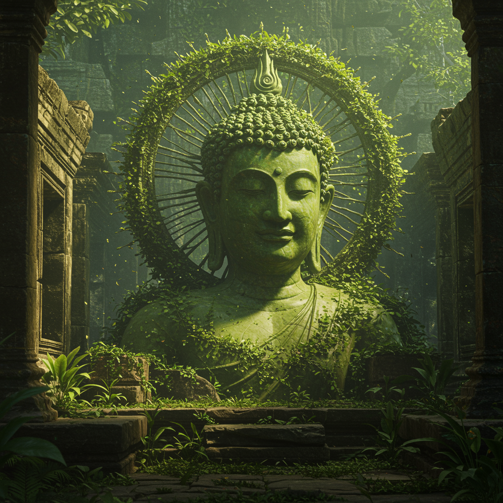 Buddha surrounded by a halo of lush green leaves, inspired by the essence of ancient jade; a depiction of a deity embodying wisdom and vitality. The composition is central and the rendering vivid in detail, showcasing photorealistic anatomy with an extreme level of intricacy. This digital masterpiece, reminiscent of artwork by Ed Blinky, Jeremy Mann, Greg Manchez, and Gregg Rutkowski, is realized using cutting-edge technologies like Unreal Engine 5. With a cinematic and atmospheric quality, the work features a sharp focus and deep contrast, capturing hyperrealism in 4K resolution. Set in a Cambodian jungle temple, the elegant scene is imbued with dramatic flair and enhanced by complex background details. The art reflects a trend for ArtStation, with vivid colors and great depth of field, standing as a true concept art achievement.