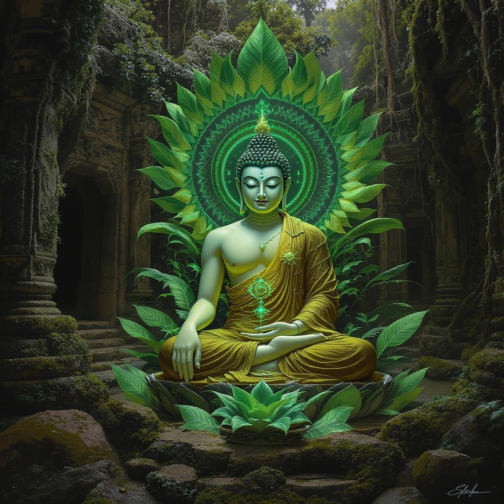 Buddha surrounded by a halo of lush green leaves, reminiscent of ancient jade, embodies serenity and wisdom. This artwork depicts a deity of life in an epic, full-face rendering with vivid, anatomical details. The composition is central and elegant, enhanced by visual effects akin to Unreal Engine 5. The scene is extremely detailed with complex textures, set in a Cambodian jungle temple. The atmosphere is cinematic and sensual, with sharp focus and hyperrealistic depth of field. This masterpiece features vivid colors in 4k, styled as concept art trending on Artstation. Influences include Ed Blinky, Jeremy Mann, and Greg Manchez, drawing on complex details and dramatic photorealistic painting techniques by Midjourney and Gregg Rutkowski. The figure is carefully rendered with accurate anatomy and graceful contours. The background boasts intricate detail, capturing the mystical ambiance of the jungle and temple environment.