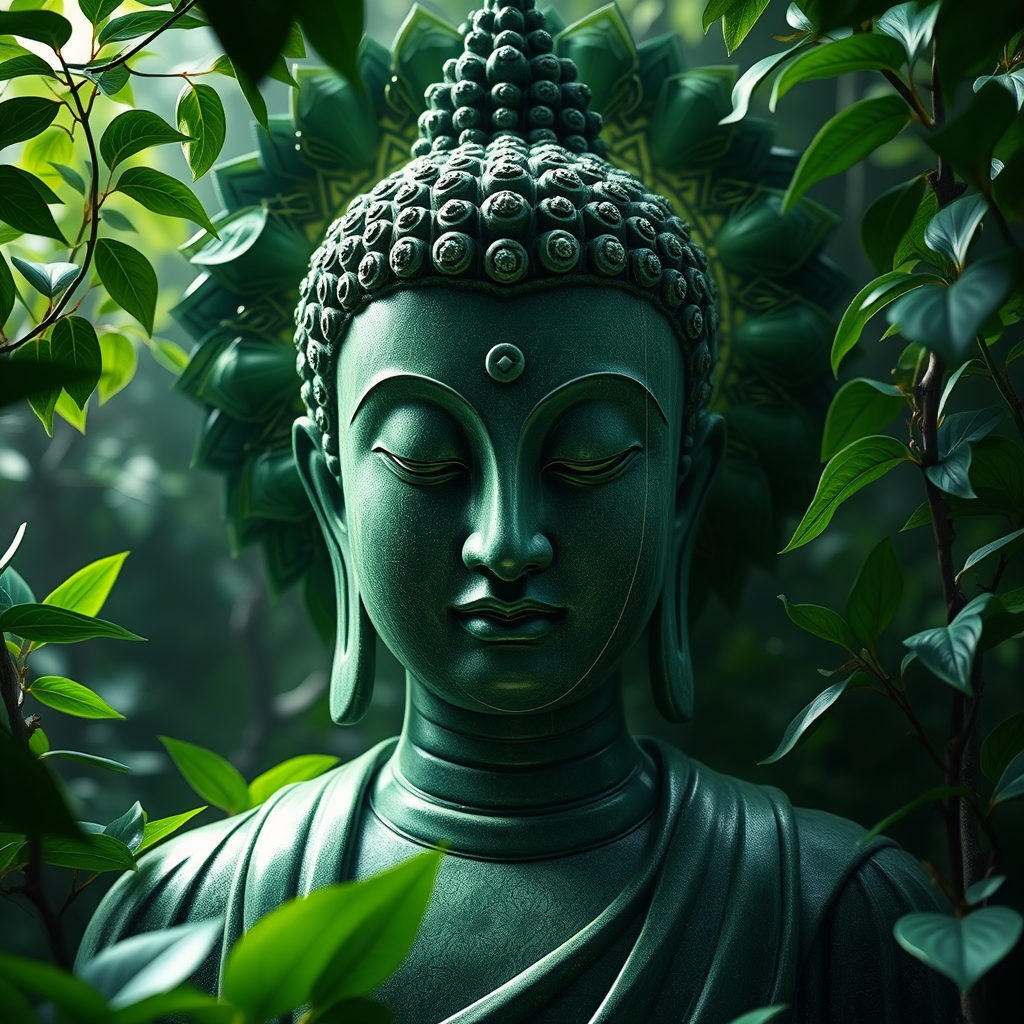Buddha surrounded by a halo of vibrant green leaves, embodying the timeless essence of old jade. A deity of profound wisdom and life, depicted in an epic, full-face view with vivid details. The composition focuses on anatomical precision and photorealistic rendering, highlighting extremely detailed and complex elements. The central composition is elegant, enhanced by VFX and the capabilities of Unreal Engine 5. The art is extremely contrasty, atmospheric, ultra-detailed, and cinematic, capturing a sensual and sharp focus with hyperrealistic precision. The artwork boasts great depth of field, a true masterpiece with vivid colors in 4K resolution, ideal for concept art trending on ArtStation. The background is rich with detail, depicting a Cambodian temple enveloped in a lush jungle. Inspired by artists like Ed Blinky, Jeremy Mann, and Greg Manchez, the art trend for ArtStation emphasizes complex detail and sharp focus. The dramatic and photorealistic painting by Mijourney and Gregg Rutkowski showcases a harmonious blend of body and neck, skillfully avoiding fragmented, disfigured elements like poorly drawn hands or extraneous fingers, maintaining an impeccable artistic vision.