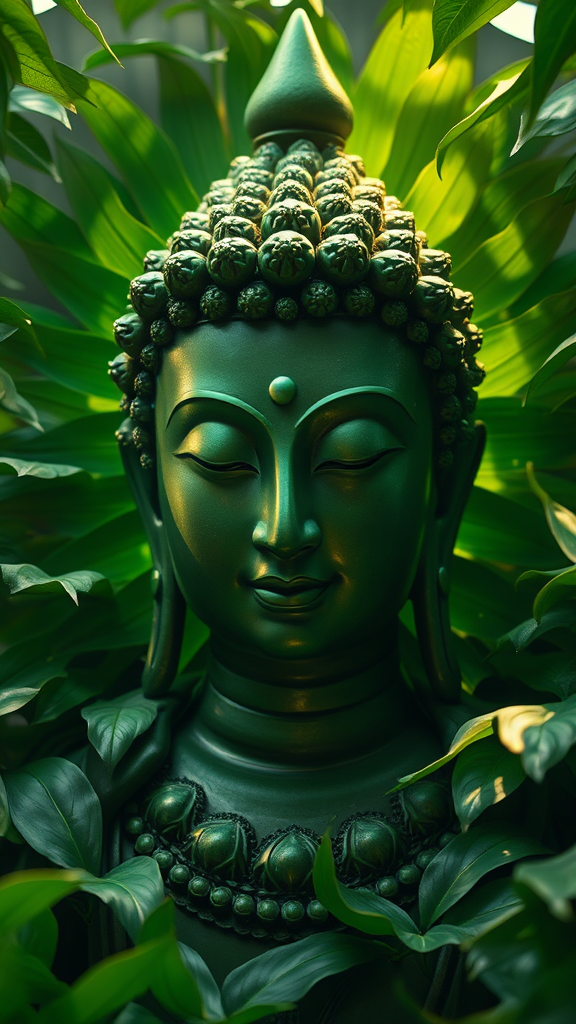 Buddha surrounded by a lush halo of verdant leaves, resembling ancient jade, embodies a deity of wisdom and vitality. The composition is strikingly central, with the face rendered in photorealistic detail, capturing the essence of life and sagacity. The scene is intricately detailed, utilizing the latest technology for artistic creation, with spectacular visual effects enhancing the atmospheric depth. The setting is steeped in the mystique of a Cambodian jungle temple, bathed in vibrant colors that pop against dramatic contrast, all presented in cinematic sharp focus. The piece resonates as a hyperrealistic masterpiece, drawing inspiration from the likes of Jeremy Mann and Greg Manchez, with echoes of Mijourney and Gregg Rutkowski's style infusing the art with complexity and elegance. Every element is thoughtfully designed to ensure a flawless anatomical portrayal, free of disfigured or mutated forms, offering a seamless blend of nature and divinity in a trend-worthy ArtStation concept.