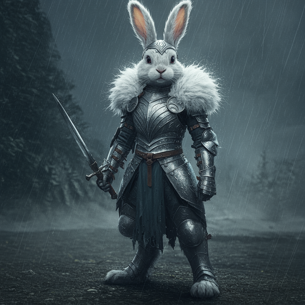 View this AI-generated image featuring bunny in intricately designed light armor with fluffy fur amidst a misty rain soaked and stormy environment captured with a 70mm cinematic lens emphasizing a highly detailed aesthetic while incorporating negative space and atmospheric effects for contrast. Crea