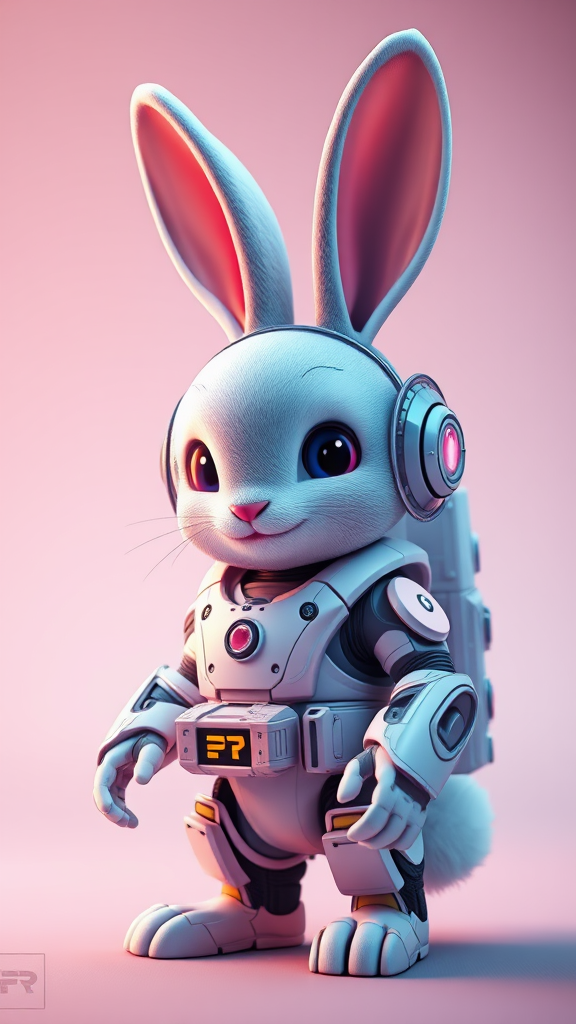 Bunny equipped with a futuristic exosuit, Pixar-style, soft pastel tones, featuring lifelike and realistic lighting and shadows, high-quality, ultra-detailed, 3D render, created using Cinema 4D and Octane Render, employing advanced ray tracing technology, rendered in stunning 8k resolution.