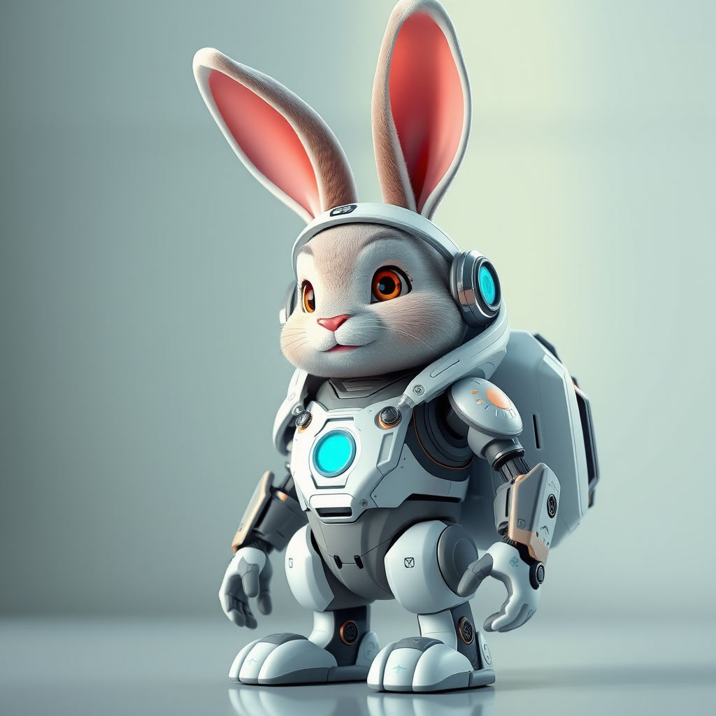 Bunny equipped with a futuristic mechanical suit, designed in a Pixar-inspired style, featuring a pastel color palette with soft transitions. The scene showcases natural lighting and realistic shading, emphasizing high-quality and ultra-detailed features. Presented as a 3D render with intricate details using the latest rendering technology such as C4D and Octane, enhanced with ray tracing for depth. Rendered in stunning 8k resolution, the image captures the essence of an imaginative world where technology meets whimsical charm.