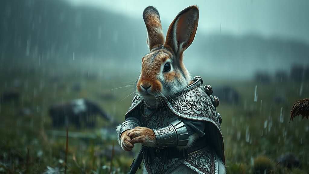 bunny in intricately decorated light armor, with soft fluffy fur, set in a misty and rain-soaked landscape during a turbulent storm, captured with a 70mm cinematic lens, showcasing a highly detailed scene with slightly altered tones to enhance the dramatic atmosphere, perfect for overcoming common negative image artifacts.