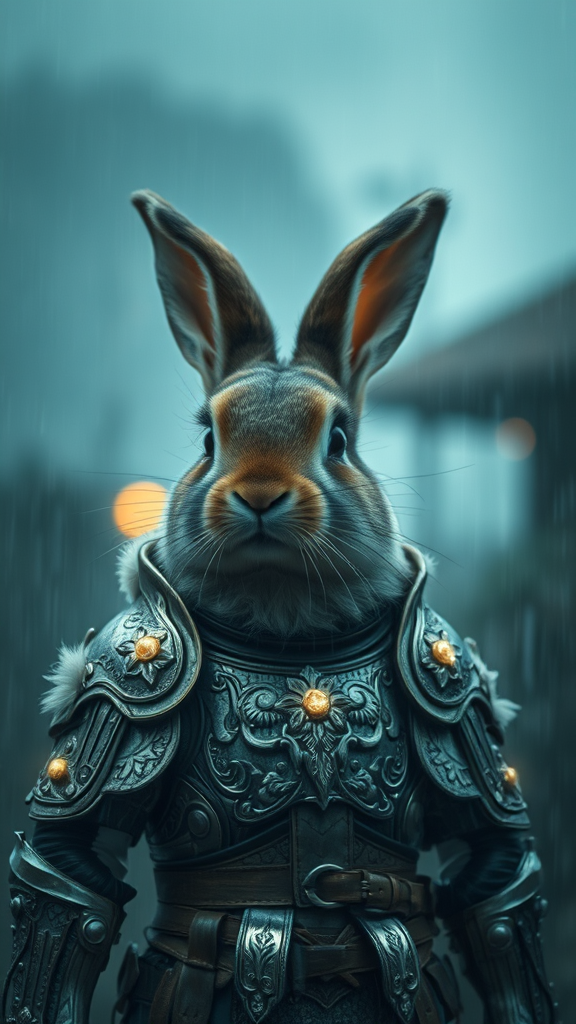 Bunny wearing intricately adorned light armor with fluffy fur glistening in a foggy and rain-soaked ambiance, stormy skies overhead; captured with a cinematic 70mm lens, offering high detail and clarity, soothing negative space and artfully avoiding poor image elements, creating an immersive and captivating scene.