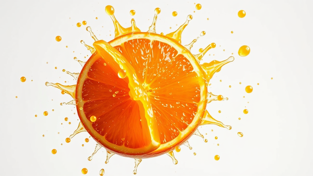 Bursting tangerine dissected mid-air by Nychos, segments and pulp suspended against a pristine white background, with vibrant citrus hues contrasting sharply, creating a dynamic explosion of juicy textures and intricate details.