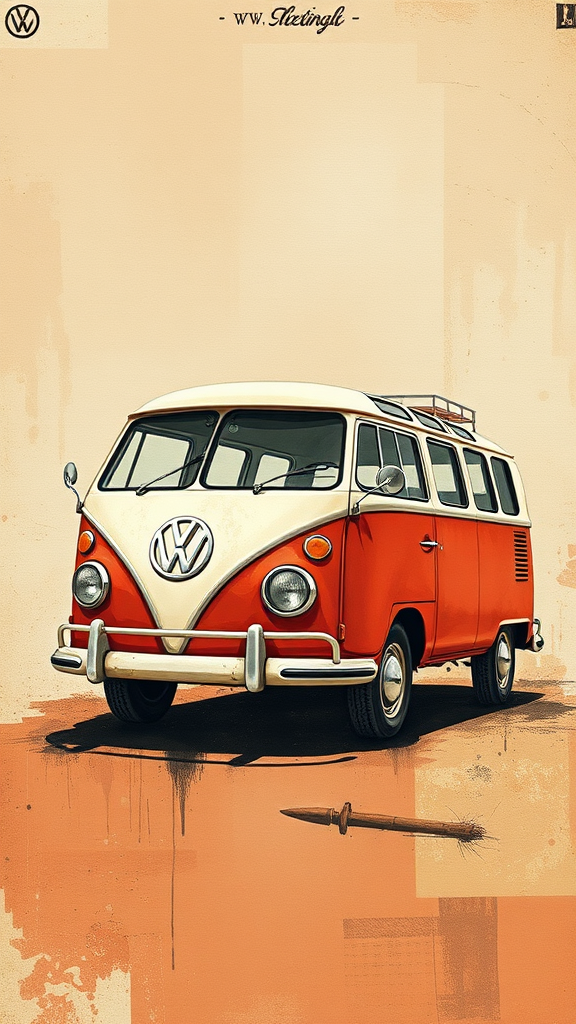 A charming VW bus illustrated on canvas art with abstract printing techniques, drawing inspiration from the atmospheric style of Brian Mashburn. The light red and light brown hues mingle with the whimsical touch of Theo Prins. This piece captures the essence of Pierre Pellegrini with a vintage cut-and-paste aesthetic and hints of rusty debris. The overall composition blends classic character illustrations, evoking a nostalgic yet modern feel.