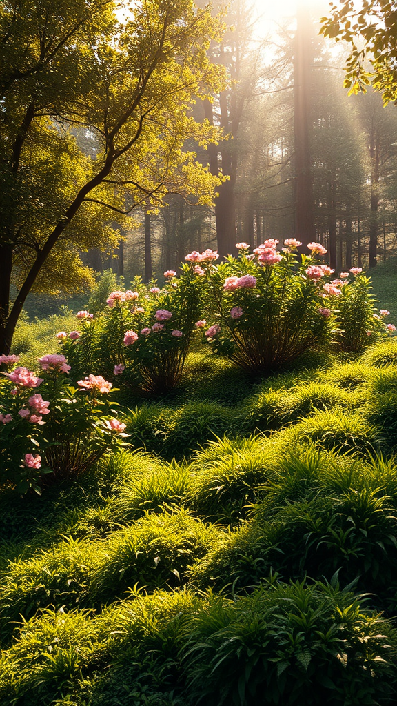 Bush, daylight, fantasy landscape, flowering plants, lush forest, vibrant grass, green hues, leafy canopy, sunlit light rays, soft moss, natural beauty, absence of humans, serene outdoors, captivating scenery, gentle sunbeam, warm sunlight, towering trees. Remove distortions, ensure anatomical accuracy, maintain high quality, avoid unnatural proportions, preserve aesthetic integrity, enhance visual harmony.