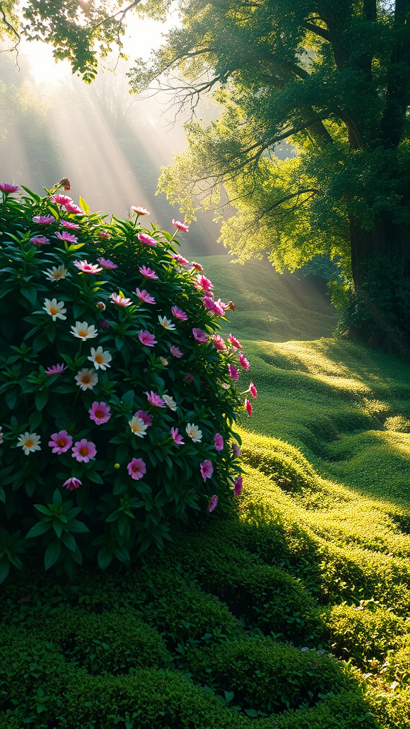 Bush, daylight, fantasy landscape, vibrant flowers, lush forest, verdant grass, green hues, intricate leaves, gentle light rays, soft moss, untouched nature, absence of humans, picturesque outdoors, stunning scenery, warm sunbeams, radiant sunlight, majestic trees.