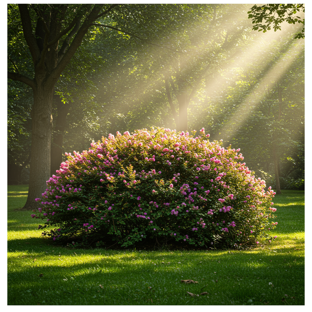 Bush, daylight, fantasy realm, vibrant blooms, enchanted forest, soft grass, verdant hues, leafy wonderland, luminous rays, emerald moss, natural paradise, untouched by humans, expansive outdoors, beautiful scenery, sunlit beams, golden sunlight, towering trees.