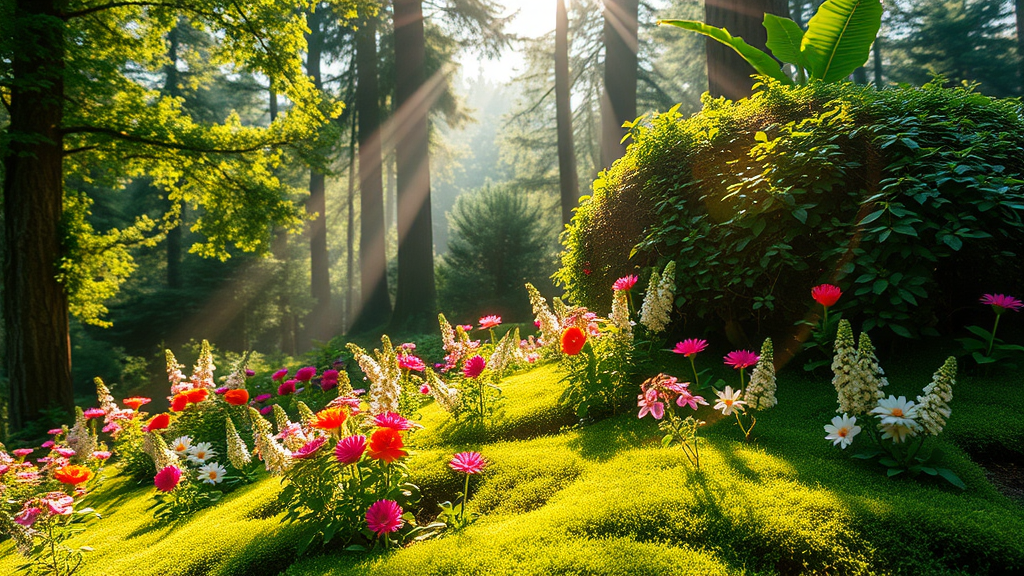 Bush, daylight, fantasy scenery, vibrant flowers, lush forest, soft grass, green palette, delicate leaves, illuminating light rays, velvety moss, serene nature, humanless atmosphere, outdoor landscape, radiant sunbeam, warm sunlight, towering trees.