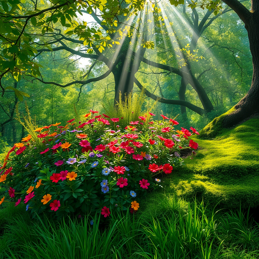 Bush, daytime, fantasy setting with colorful flowers, a lush forest, vibrant green grass, and a rich green theme. Leaves in abundance, light rays filtering through the canopy, and moss-covered surfaces suggest a serene, untouched nature scene. Scenery focused on the outdoors with no presence of humans, where sunbeams pierce through, highlighting the intertwined branches and towering trees.