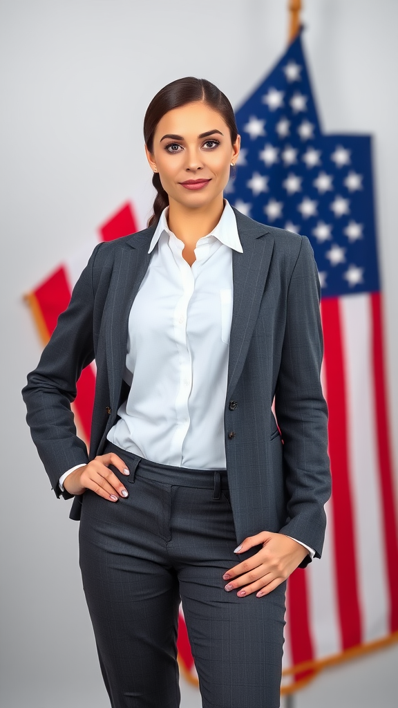 Businesswoman poses confidently in front of the American flag, symbolizing patriotism and success.