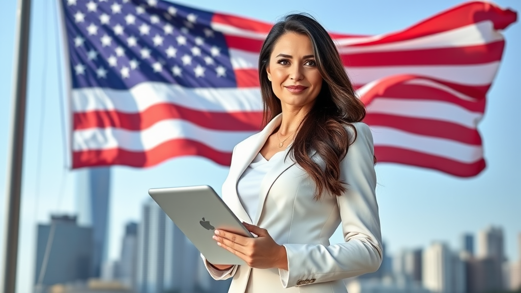 Businesswoman posing confidently in front of a waving American flag, with a city skyline in the background, and a subtle smile on her face, wearing a sleek white business suit and holding a tablet.