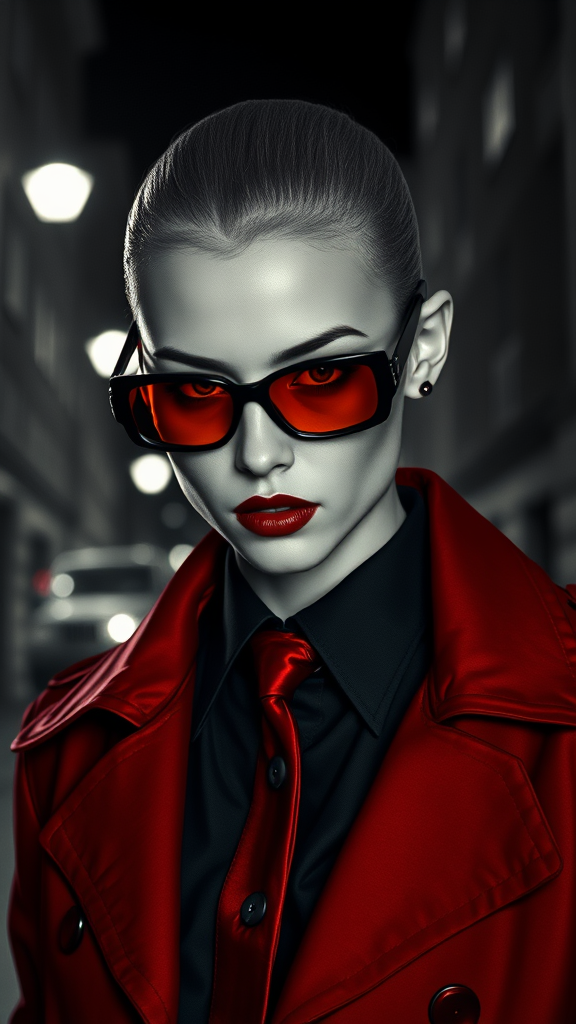 B&W portrait of a female vampire from Clan Tremere, showcasing a beautifully detailed face with a striking lack of hair, adorned in a stylish red trench coat over a black buttoned-up shirt and a vivid red necktie. She wears sunglasses with orange lenses, embodying the "Vampire: The Masquerade" aesthetic. Her face is perfectly symmetrical, set against a city backdrop lit by streetlights at night. The image captures a lifelike essence with real skin textures and dramatic play of shadows, achieving a photorealistic and hyper-detailed quality reminiscent of film noir. The emphasis is on her intricate and realistic skin texture, highlighted by soft lighting and subtle subsurface scattering, all contributing to a cinematic masterpiece, rendered in the highest quality possible.
