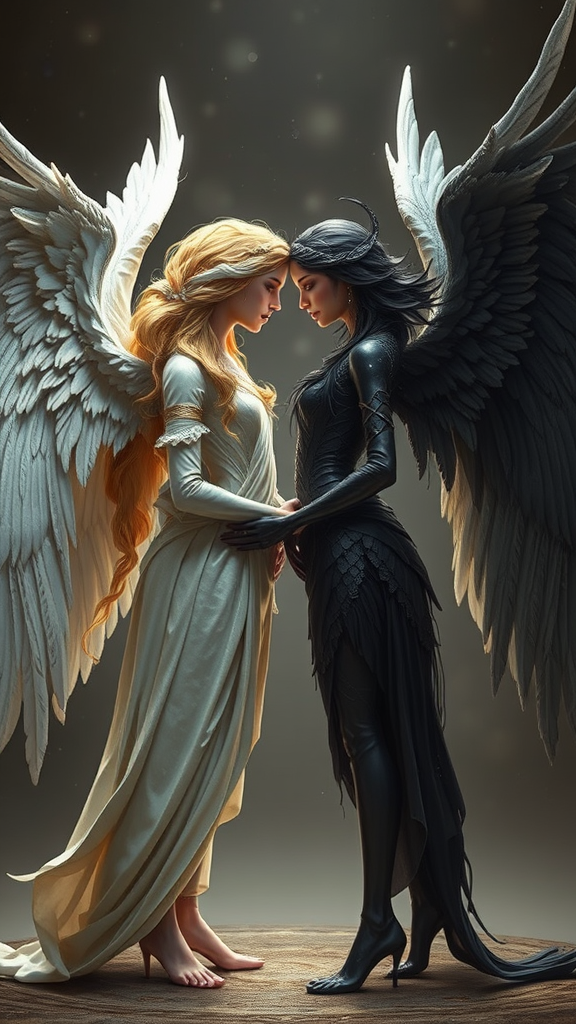 By Alexander Jansson and Android Joines | Two stunning angels with contrasting features, one with shimmering golden hair and brilliant white wings, and the other with radiant dark beauty and magnificent black wings, facing each other and standing together in harmony, detailed and visually captivating, full-body, 2D | Subtle imperfections, slight jpeg artifacts, minor compositional quirks, unique perspective, imaginative body positioning, intriguing facial expressions, distinct eyes, individualistic features, slight asymmetry, creatively unconventional anatomy, atmospheric composition, artistic interpretation.