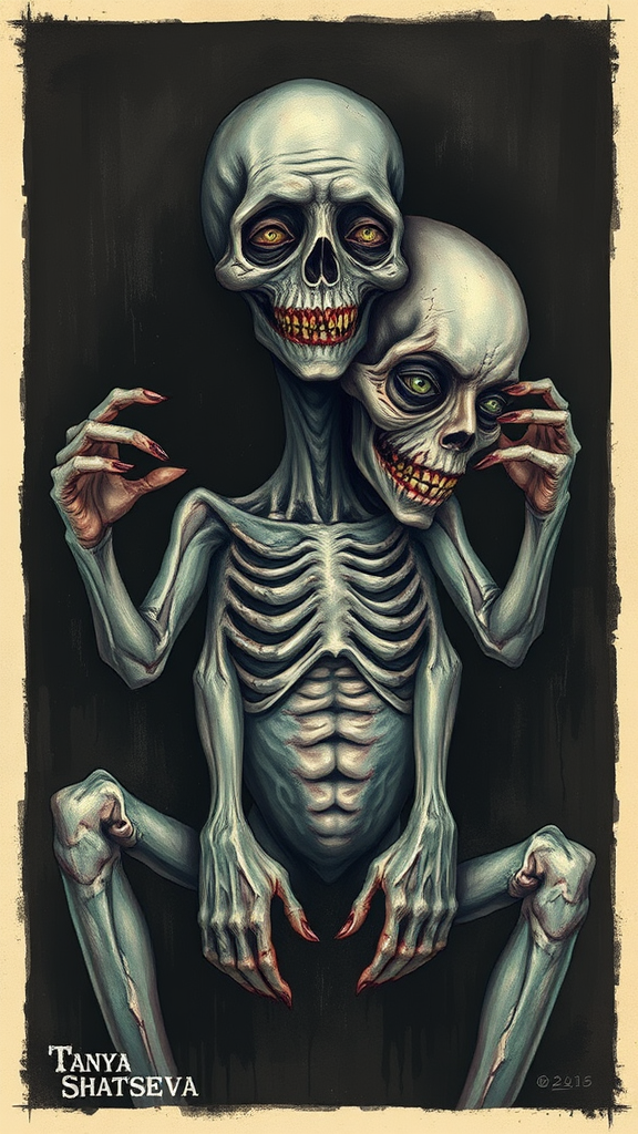 by tanya shatseva, dark, unsettling, eerie, chaotic, text, low quality, jpeg artifacts, unattractive, duplicate, morbid, distorted, poorly drawn hands and face, mutation, deformed, fuzzy, desiccated, flawed anatomy, disproportionate, extra limbs, cloned visage, disfigured, awkward proportions, malformed limbs, missing arms and legs, surplus arms and legs, elongated neck, camera, name, watermark, logo, cut off, obscured, flawed anatomy, flawed body, flawed face, flawed teeth, distortions.