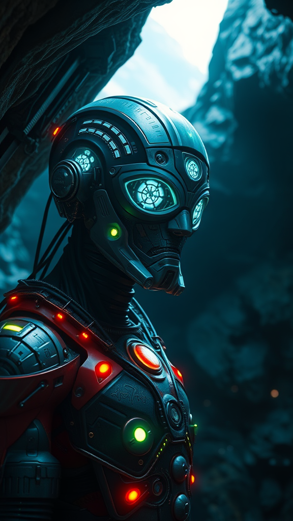 c4ttitude as a trekborg in a mountain cave, best quality, extreme detail, moody lighting, Sci-Fi, Star Trek, glow effect, LED displays, cinematic environment, 16k, UHD, HDR, futuristic ambiance, enhanced cybernetic features, detailed techno-organic textures, eerie luminescence, immersive landscape, high-tech interfaces, cosmic atmosphere, cybernetic eyes with intricate designs, sleek metallic exoskeleton, dynamic light reflections, subtle mutations in form, atmospheric shadows, enhanced perspective, unique character design, dramatic composition, innovative reinterpretation maintaining essence.