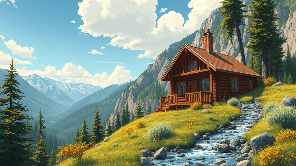 Cabin nestled on a mountainside under a clear sky depicted in a digital painting with influences from American scene painting, rendered in a vector art style. The artwork presents a detailed wide shot with a touch of 1950s illustration charm, showcasing a cozy and inviting atmosphere. The scene is enhanced by intricate 3D elements, giving it depth and warmth, while lush greenery and a gentle trickling stream add a serene touch to the picturesque setting.