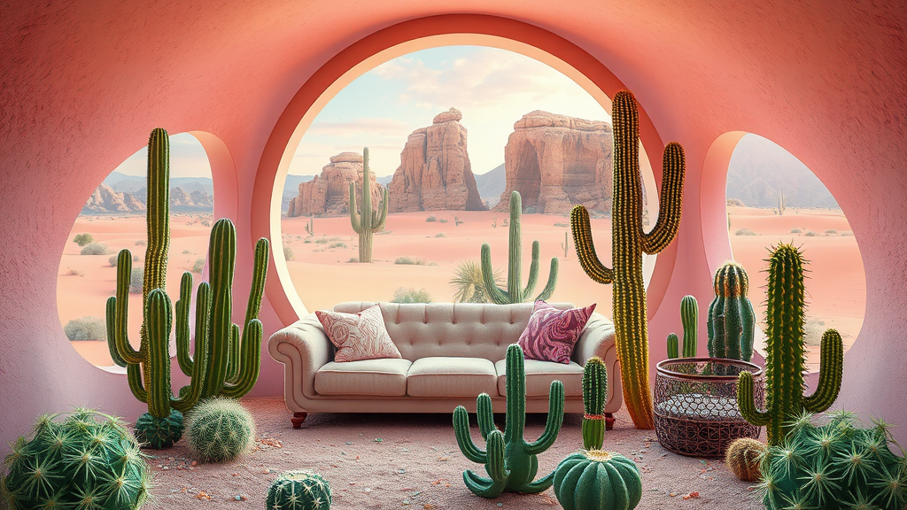 Cactus plants and a plush couch nestled in a sprawling desert landscape, surrounded by a unique round window. It captures the essence of a futuristic oasis, blending the whimsical Googie kitsch aesthetic. Itβs a design trending on Pinterest, boasting a maximalist and surreal flavor. Set in a visionary desert palace, this scene offers perfect maximalistic harmony, reminiscent of a candy land-inspired abode. Drawing inspiration from Mike Winkelmann, it features surreal colors and intricately sculpted design elements, with a gentle pastel palette. The setting exudes a playful yet sophisticated vibe, framed by curvaceous architecture that complements the surreal atmosphere.