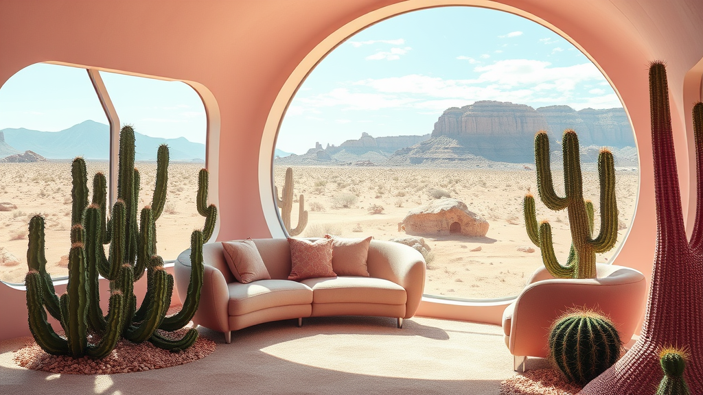 Cactus plants and a plush couch set in a vast desert landscape, framed by a large, round window. The scene exudes a futuristic Googie kitsch vibe, capturing the essence of a thriving Pinterest trend. Picture a surreal design within a grand, futuristic desert palace that embraces a perfect maximalist composition. The environment feels like a whimsical candy land, evoking the playful style of Mike Winkelmann. Surreal, vibrant colors dominate the view, with maximalist sculpted designs enhancing the pastel-colored, rounded architecture. The atmosphere is one of dreamlike elegance, where the ordinary meets the extraordinary in a harmonious blend.