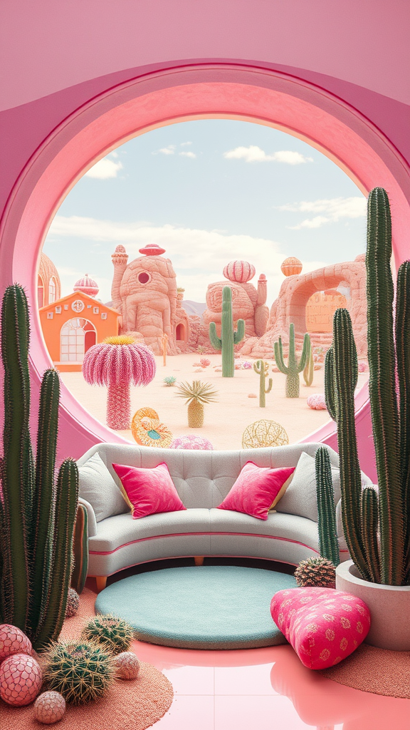 Cactus plants and a plush couch set within a surreal desert landscape, framed by a circular window. This scene exudes a blend of futuristic and googie kitsch aesthetic, capturing the current trends on Pinterest with a maximalist and whimsical flair. It's part of a fantastical desert palace, merging psychedelic maximalism with candy-colored hues. The architecture is both curved and playful, drawing inspiration from Mike Winkelmann's unique style. The setting is alive with surreal colors and elaborate sculpted designs, all set within a pastel-toned, candy land-inspired home.