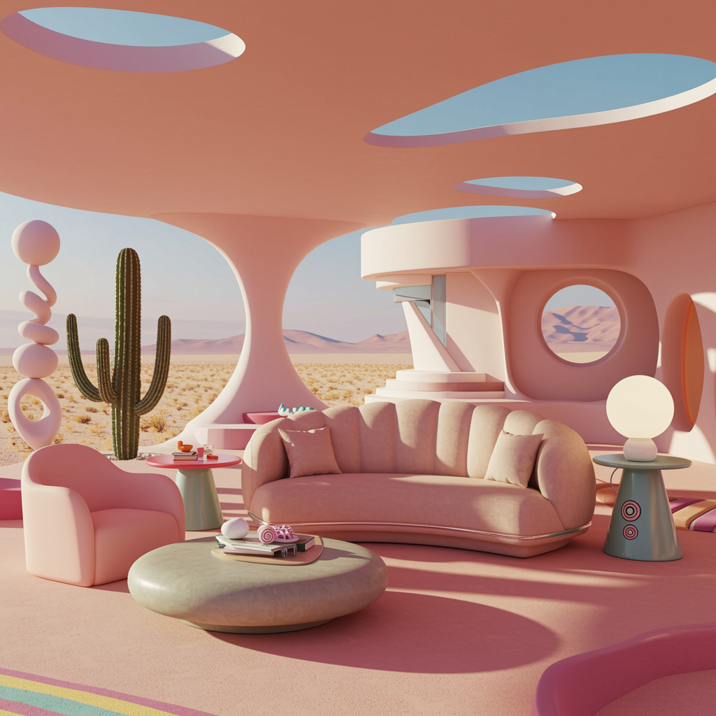 Cactus plants and a plush, retro-futuristic couch set against a sprawling desert backdrop, highlighted by a distinctive round window. Embracing a googie kitsch aesthetic with maximalist, surreal design elements, the scene unfolds within an extravagant desert palace. This setting showcases curvy, candy-colored architecture with a hint of Mike Winkelmann's surreal influence. The composition revels in bold, sculpted designs with playful pastel hues, creating an enchanting oasis of vibrant imagination in a candy land-like house.