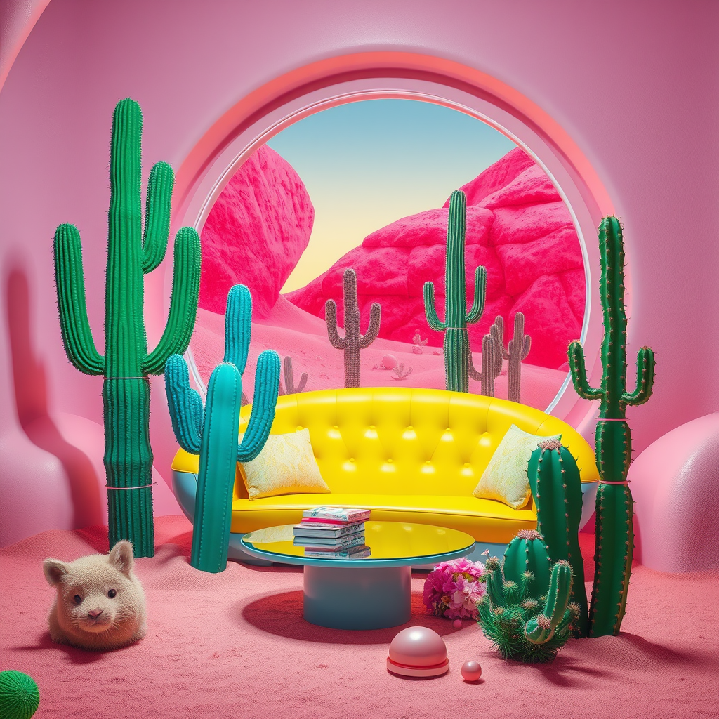 Cactus plants and a retro-futuristic couch in a desert setting with a large circular window, embodying a Googie-inspired aesthetic and trending maximalist designs on Pinterest. This surreal composition is set in a futuristic desert palace with vibrant and eclectic elements, reminiscent of a whimsical candy land, inspired by Mike Winkelmann. The scene features surreal, pastel colors and a sculpted, rounded architectural design, creating a playful and dreamlike atmosphere.