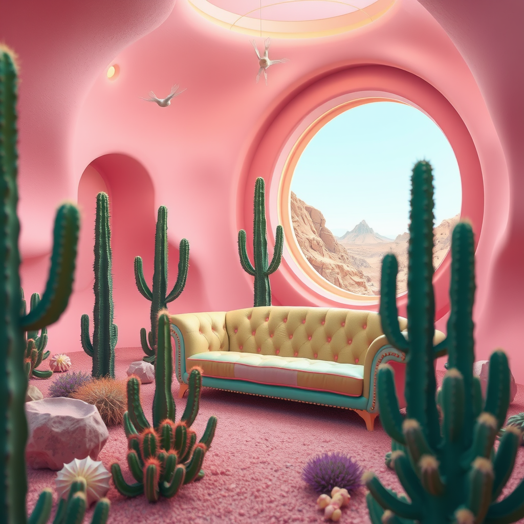 Cactus plants and a vibrant couch in a surreal desert landscape, featuring a large circular window with a futuristic flair, showcasing a blend of googie kitsch aesthetic and maximalist design, reminiscent of an opulent desert palace with candy land elements. The scene is inspired by Mike Winkelmann, with whimsical pastel colors and rounded, sculpted architecture, creating a visually striking and imaginative composition that evokes a dreamlike maximalist wonderland.