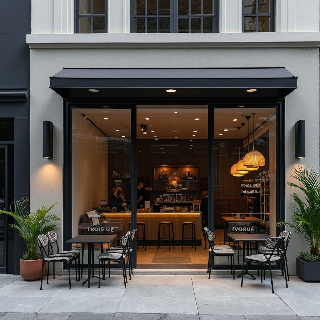 A sleek and modern cafe storefront emerges, showcasing minimalist design elements with large glass windows and a polished metal frame. The crispness of the scene highlights the clean lines and uncluttered aesthetic, with simple black-and-white signage casting a sharp contrast against the muted tones of the building. Potted greenery provides subtle touches of nature, while soft, ambient lighting from within creates a warm and inviting atmosphere. Contemporary outdoor seating complements the modern vibe, offering a perfect fusion of style and simplicity.