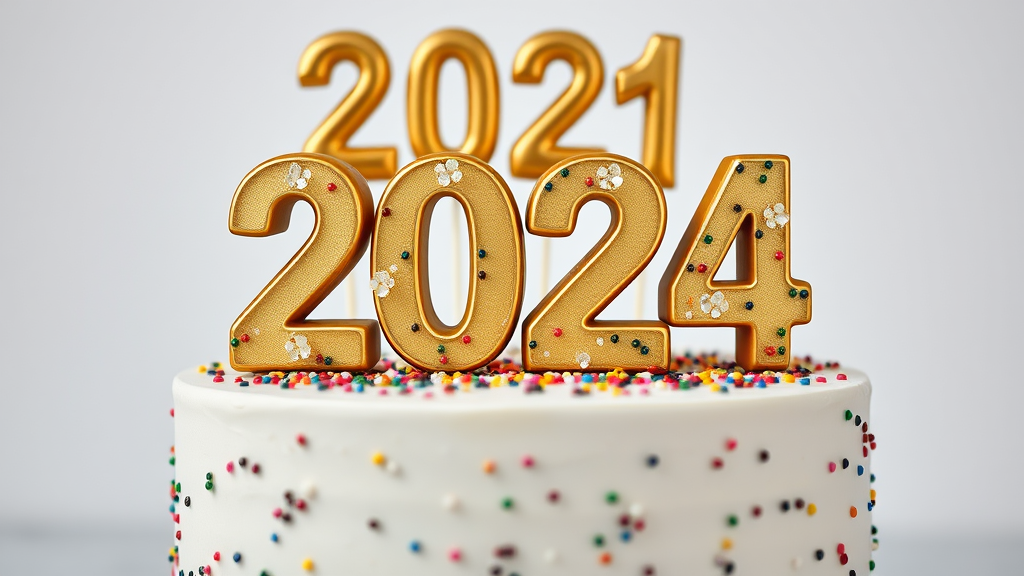 Cake celebrating New Year's 2024, close-up portrait, hyper-realistic visual, standard lens range between 35mm and 85mm, shot with natural lighting using a Canon SL3 DSLR, set against a clean white backdrop. The image embodies high-quality and best-in-class graphics, delivering high-resolution, cinematic stills akin to digital painting. The scene is intricately detailed and presented in 8k HD, 4k HD, with dynamic lighting, textural intricacies, captured in 32K HD for a visually stunning composition, exuding a festive yet elegant feel.
