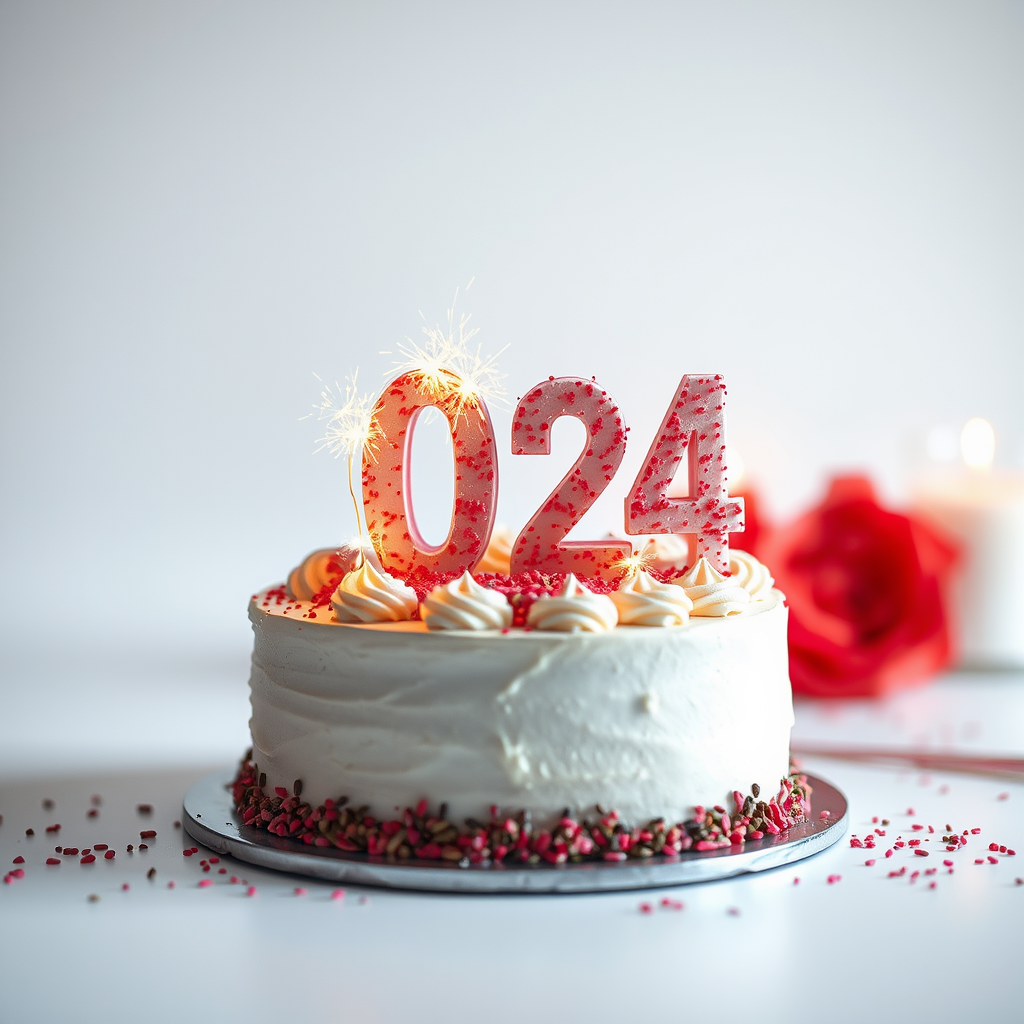 Cake celebrating New Year's 2024, intimate close-up, superb realism, shot through a 50mm standard lens, lit naturally, captured with a Canon SL3 DSLR. Set against a pristine white backdrop, the image exudes high-quality, remarkably clear graphics with exceptional resolution. Envisioned as a cinematic still, this digital painting is highly detailed, presented in 8k HD with options up to 32K HD, featuring dynamic lighting and intricate details. The composition is flawless, maintaining a perfect blend of creativity and technical excellence.