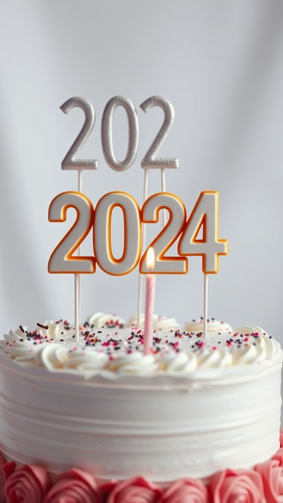 Cake celebration for New Year's 2024, close-up portrait, ultra-realistic, standard lens range 35mm-85mm, natural illumination, Canon SL3 DSLR, pristine white backdrop, top-tier quality, superior graphics, high-resolution imagery, breathtaking quality, cinematic essence, digital artwork, meticulous detailing, 8k HD, 4k HD, dynamic lighting, intricate features, 32K HD, flawless composition, with subtle artistic enhancements enriching the original concept.