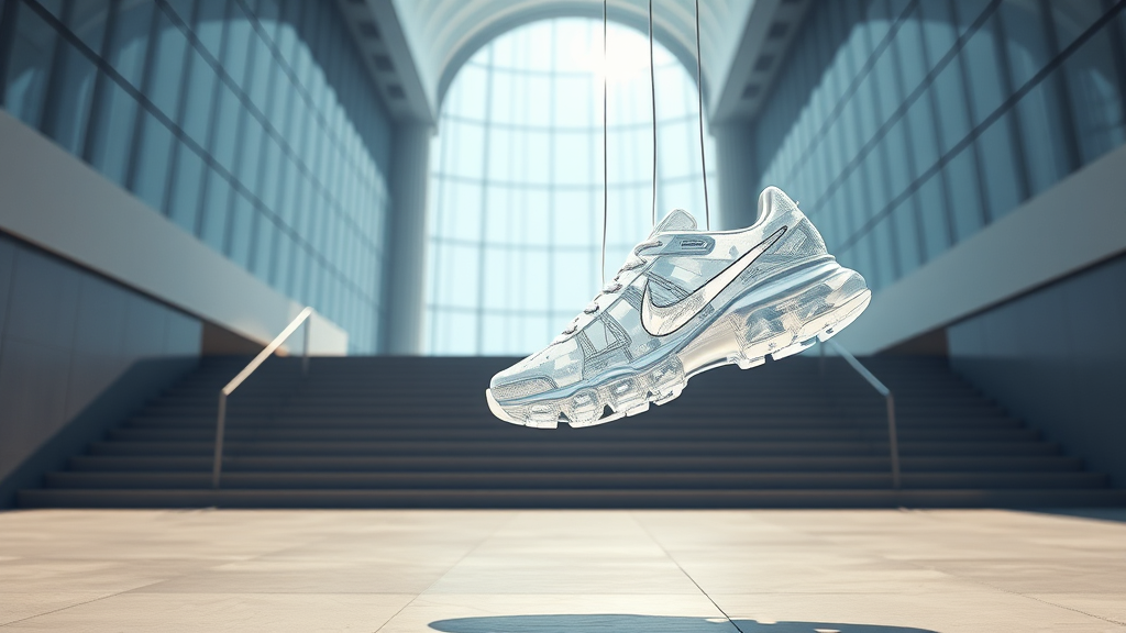 Calm and well-contrasted scene featuring a set of futuristic Nike trainers, suspended in the air as if defying gravity. The translucent materials of the sneakers catch the light, creating a bright and ethereal glow. The intricate design resembles a scientific experiment, highlighting cutting-edge product design. The setting includes modern stairs and a giant GUM architecture in the background, rendered in stunning detail using Octane. The atmosphere is serene yet dynamic, with a playful, slightly chaotic energy, evoking a sense of innovation and freedom.