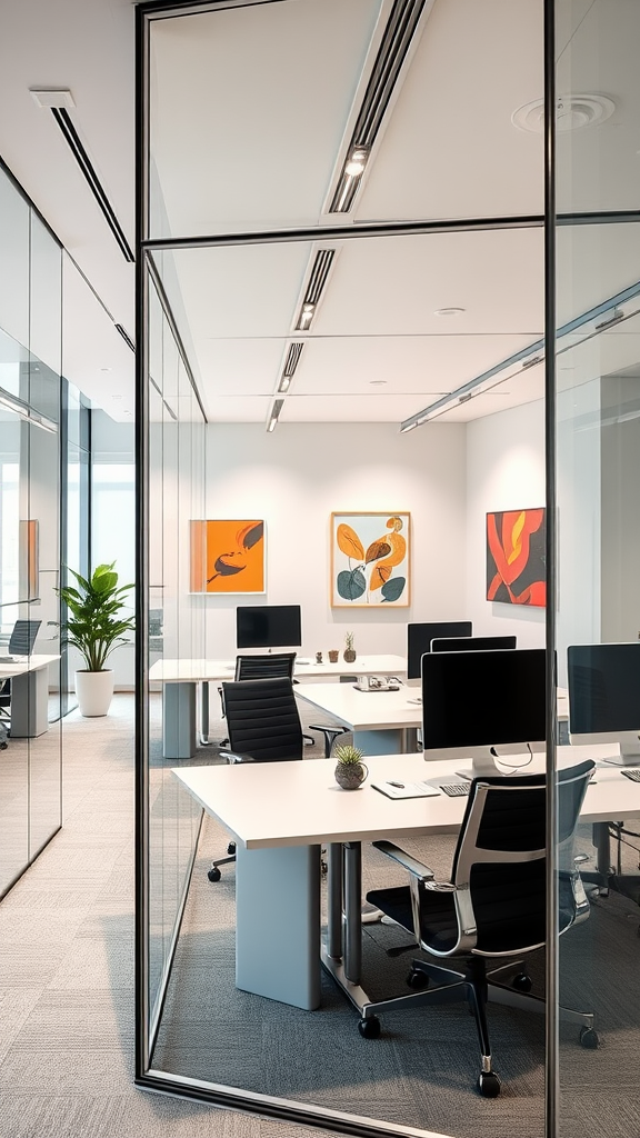 Candid capture of a modern office space featuring minimalist, ergonomic design. Enclosed by sleek glass walls, the interior flows with linear precision, complemented by a neutral color palette. Splashes of vibrant art punctuate the decor, adding energetic vitality. Soft studio lighting casts a gentle glow across the innovative workspace, enhancing the harmonious blend of form and functionality.
