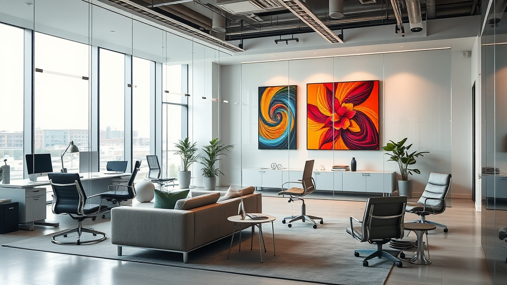 Candid image of a contemporary office setting, showcasing a minimalist design with ergonomic furnishings. The space features transparent glass walls and sleek architectural lines. The decor includes a neutral color palette highlighted by vivid, eye-catching art pieces. Soft studio lighting enhances the ambiance, adding warmth and sophistication to the overall scene.