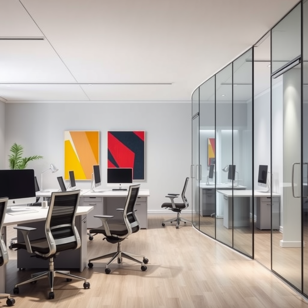 Candid photograph capturing a minimalist office space featuring ergonomic furniture and transparent glass walls, highlighted by sleek lines and a neutral color palette. Vibrant art pieces add a splash of color amid the understated design. Soft studio lighting enhances the modern, airy atmosphere.