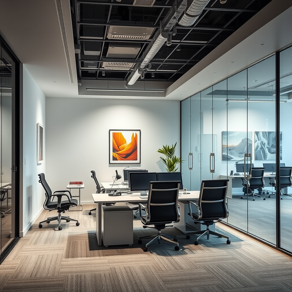Candid photograph capturing a minimalist office space featuring ergonomic furniture and glass walls, characterized by sleek lines and a neutral color palette complemented by vivid art pieces. The scene is illuminated by studio lighting, enhancing the modern aesthetic. Vertical framing emphasizes the elegant design and open ambiance.