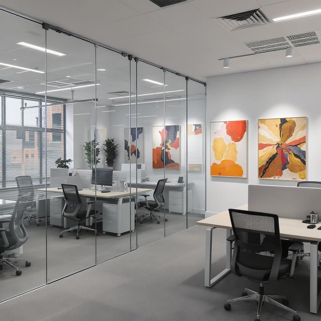 Candid scene in a modern office environment featuring minimalist design with ergonomic furniture and transparent glass partitions. The space is defined by sleek, clean lines and a neutral color palette, contrasted by vivid, striking art pieces adorning the walls. Bathed in studio-quality lighting, the atmosphere exudes both efficiency and creativity, encapsulating a contemporary professional setting.