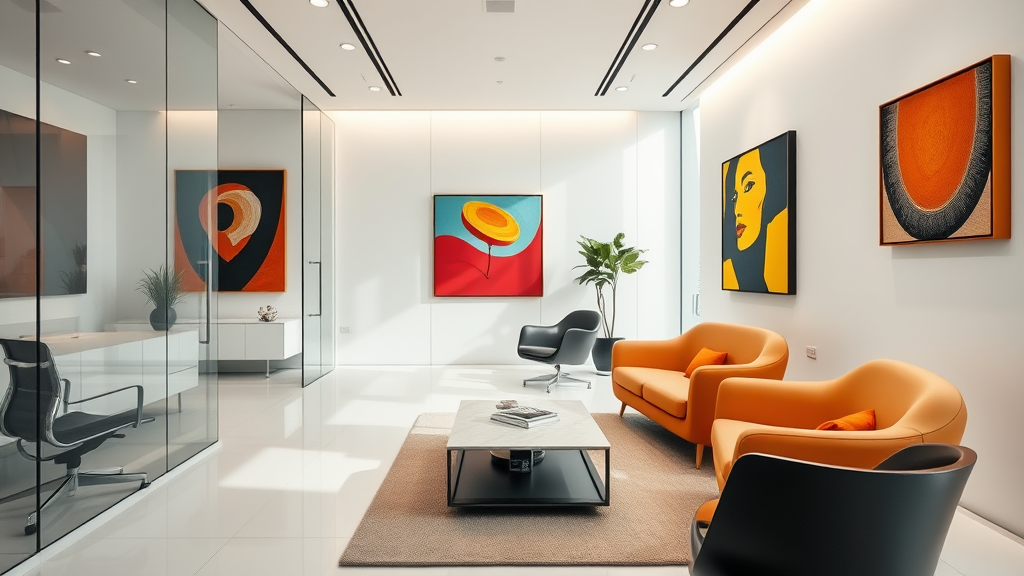 Candid shot capturing a minimalist office space with sleek, ergonomic furniture; the room features glass walls and a neutral color palette accentuated by bold, vibrant art pieces. The atmosphere is brightened by studio lighting, and the design emphasizes clean, flowing lines, creating a sophisticated yet inviting workspace. The overall composition balances functionality with artistic flair, presenting a modern and dynamic environment.