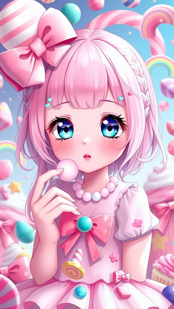 Candy-inspired anime girl, solo character, incredibly adorable with a charming expression, petite and sweet, featuring elements like cotton candy, candy cane, and bubble gum, in a vibrant color palette. Incorporating symbols such as planets, rainbows, cupcakes, bows, and gems, set in a fantasy world with intricate detail, in 8k resolution, UHD, and HDR quality. The girl has unique features, such as a semi-cloned face, intriguing eyes, a slightly elongated neck, and creatively designed hands. This imaginative scene retains its vivid charm without losing focus, capturing the essence of a candy-themed fantasy.