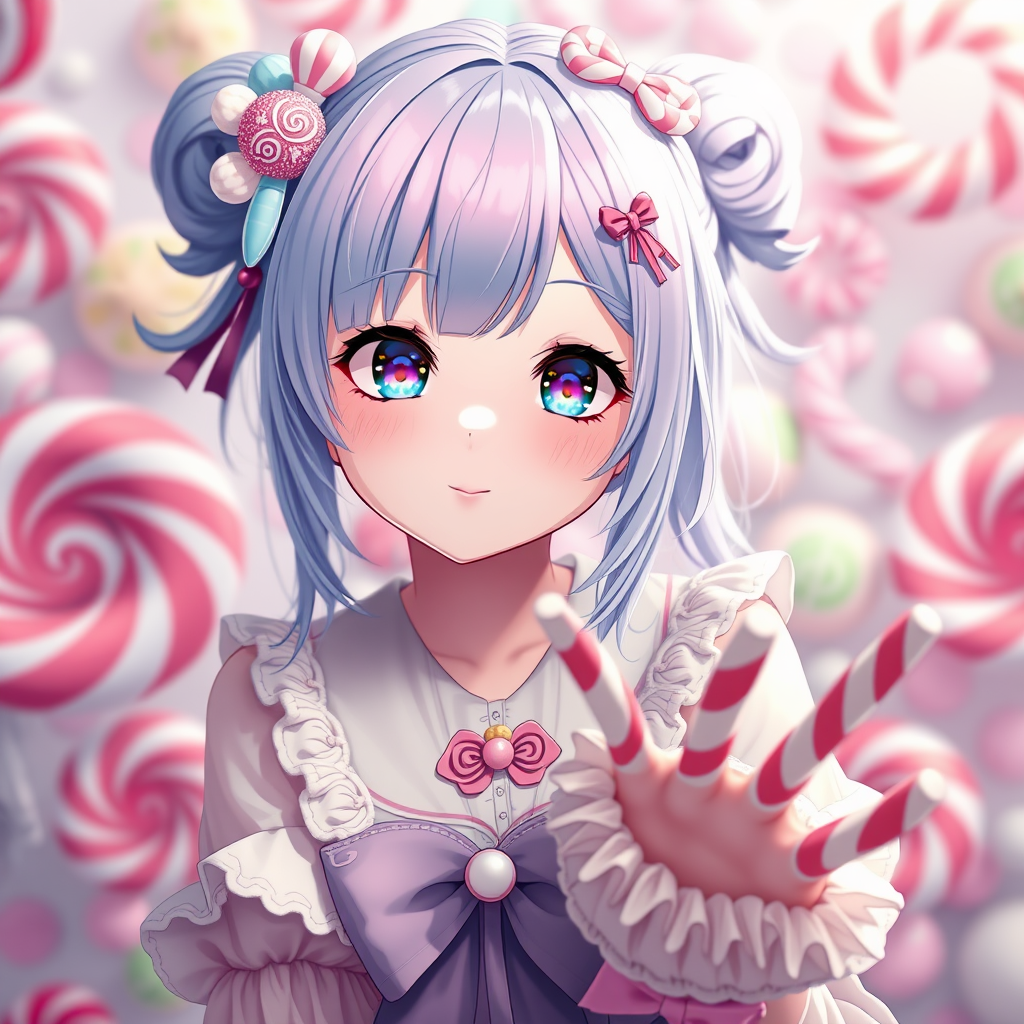Candy themed anime girl, a single character exuding super cuteness with adorable expressions and a petite frame. Her style is inspired by cotton candy, candy canes, and bubble gum, featuring vibrant colors that evoke a sense of fantasy and whimsy. She is showcased in extreme detail, with ornate designs and an emphasis on 8k, UHD, HDR quality. The scene bursts with creativity, with hints of a face duplicated or mutated, perhaps a cross-eyed look, a long neck, or extra fingers suggestive of a mutated hand. The focus remains sharp and vivid, devoid of low-resolution issues, avoiding any out-of-frame or blurry elements that would detract from the clarity. The image is crisp and free from jpeg artifacts, watermarks, logos, letters, usernames, words, or cropping that could disturb its artistic integrity, ensuring a seamless look without cartoonish split images.