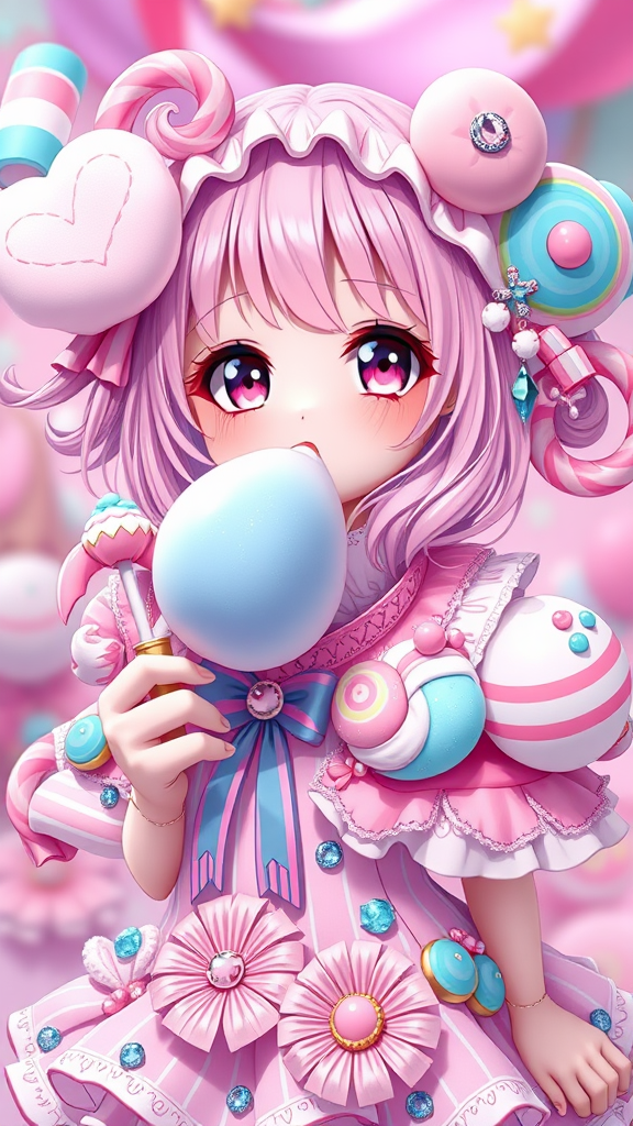 Candy-themed anime girl, single character, super cute with a charming expression, petite figure adorned with elements like cotton candy, candy cane, and bubble gum, featuring vibrant colors and a fantasy vibe. Detailed and ornate design, captured in 8k UHD HDR quality. Incorporates whimsical elements like rainbows, cupcakes, ribbons, and gems. Features an imaginative twist with unique aspects like duplicated or mutated features, long neck, and extra fingers, emphasizing creativity. Maintains a focus on a dreamy, surreal aesthetic while avoiding any distracting elements like low resolution, out-of-frame details, blurring, artifacts, or unwanted markings.