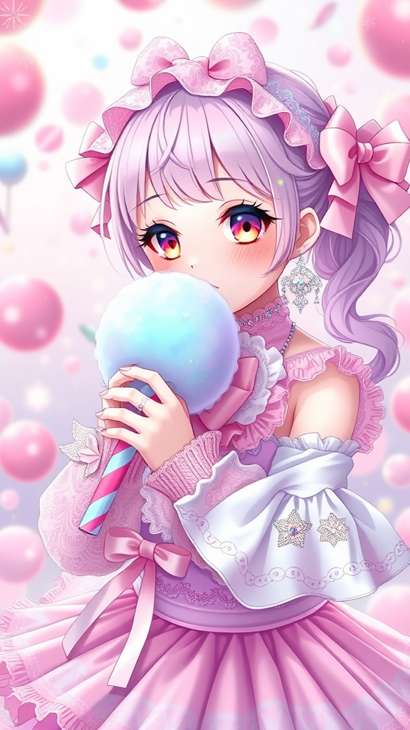 Candy-themed anime girl, Single Girl, Adorably Cute, Playful expression, Petite, cotton candy, candy cane, Bubble gum, Vibrant Colors, Fantasy, extreme detail, Ornate, 8k, UHD, HDR, blends of pastel and bright hues, whimsical setting, celestial touches, enchanting background, slight exaggeration, whimsical and dreamlike ambiance, tiny sparkling jewels, delicate ribbons, elements of fantasy, youthful energy, highly detailed outfit, charming accessories, wide-eyed wonder, a hint of mischievousness, overflowing sweetness, imaginative elements, captures the essence of joy and fun, maintaining clarity and focus, seamless composition, visually striking, harmonious blend of elements, a balance of creativity and order, flawless depiction of a vibrant universe, untouched by distortion or unnecessary effects.