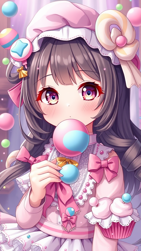 Candy-themed anime girl, solo character, irresistibly cute, charming expression, small and dainty, elements of cotton candy, candy canes, and bubble gum, lively and vivid colors, sprinkled with whimsical elements like planets, rainbows, cupcakes, ribbons, and gems. Imbued with fantasy, intricately detailed, ornate design, rendered in high-resolution 8k UHD HDR for crisp imagery. Distinctive and unique features that capture the essence of fantasy, maintaining a balance between fictional elements and captivating charm.