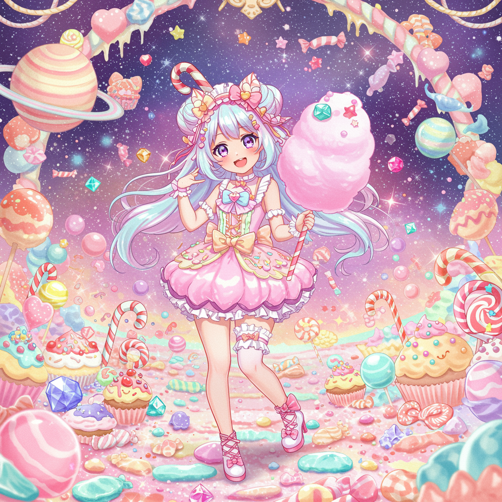Candy-themed anime girl, solo character, super cute with an adorable expression, petite, adorned with cotton candy, candy canes, and bubble gum, featuring vibrant colors and an aura of whimsy, fantasy, and extreme detail. The setting is ultra high-definition with an ornate design in 8k and HDR. Elements include a galaxy of sweets and playful motifs like planets, rainbows, cupcakes, bows, and gems, creating a fantastical scene. The character exhibits a quirky charm with a playful twist, ensuring balance and creativity in her depiction.